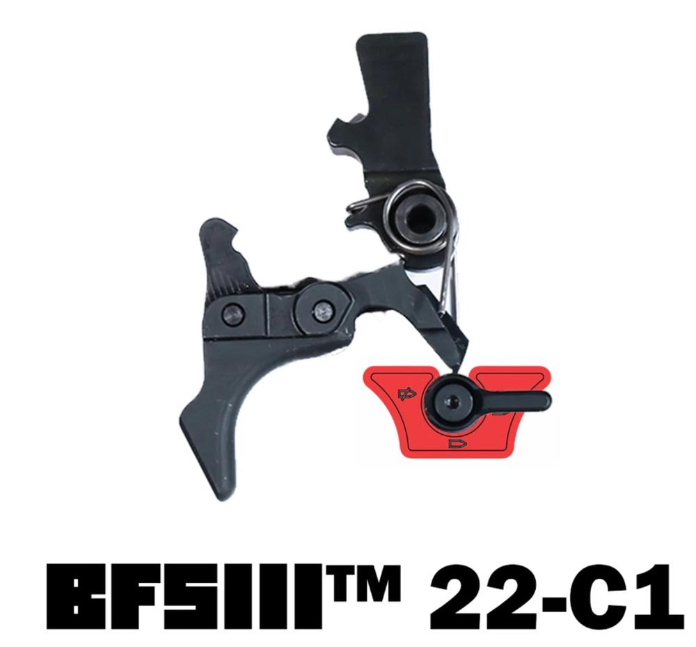 The Binary Firing System ™ GEN 3 (BFSIII™) is a 3-position trigger. In position 3, it fires one round on pull and one round on release. This trigger is ideal for having more fun than you thought was possible with your 10/22®. The ultimate .22 plinker upgrade!