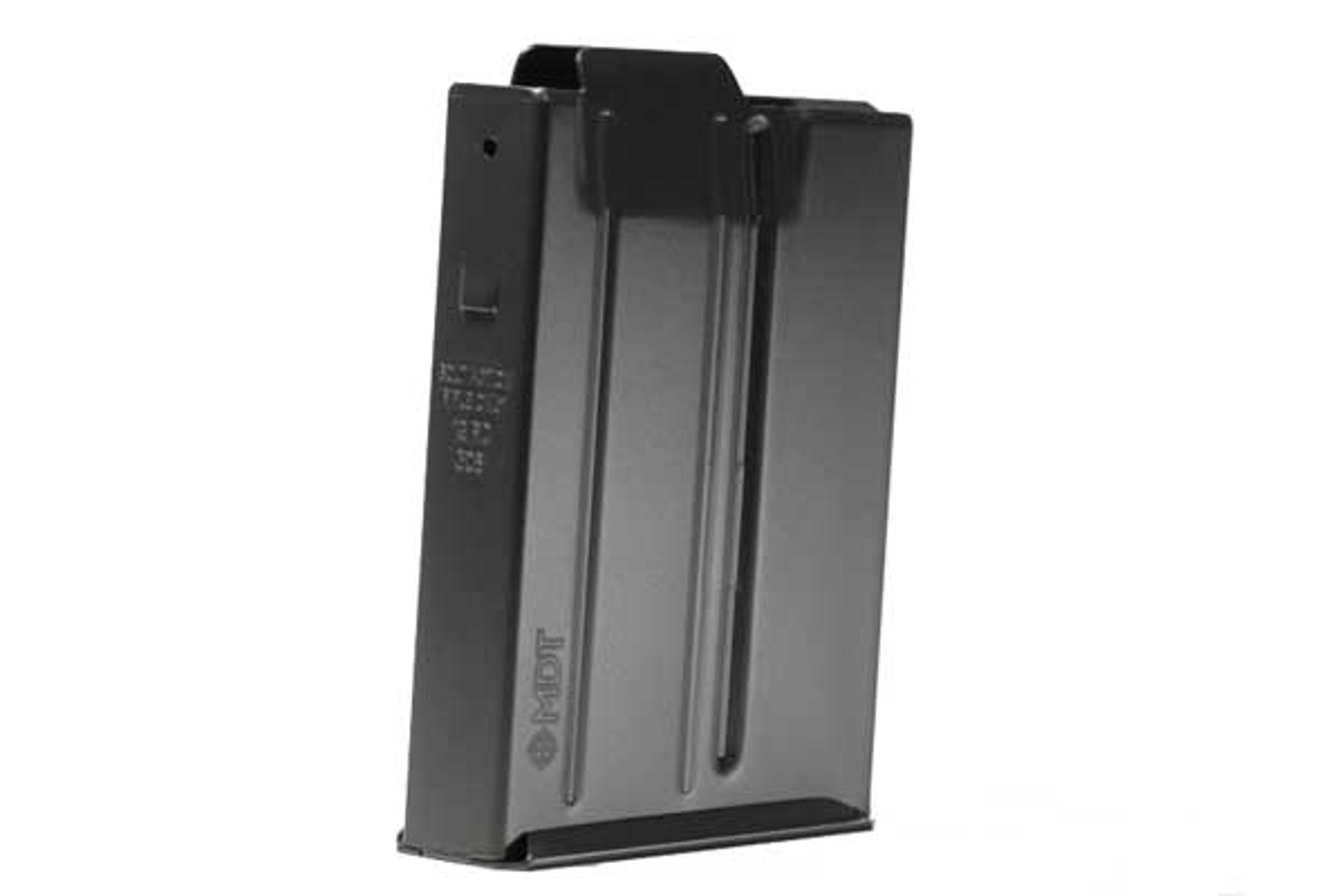 The MDT AICS-pattern metal magazines are manufactured from high strength steel and nitride-finished for ultimate durability. The short action magazines are offered for .308 Win and 6.5 Creedmoor family cartridges in 12 round capacity.